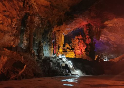 好啦,各位贵宾,再往前走是黄仙洞的主大厅了,与我们立足之处,地势高差达 78